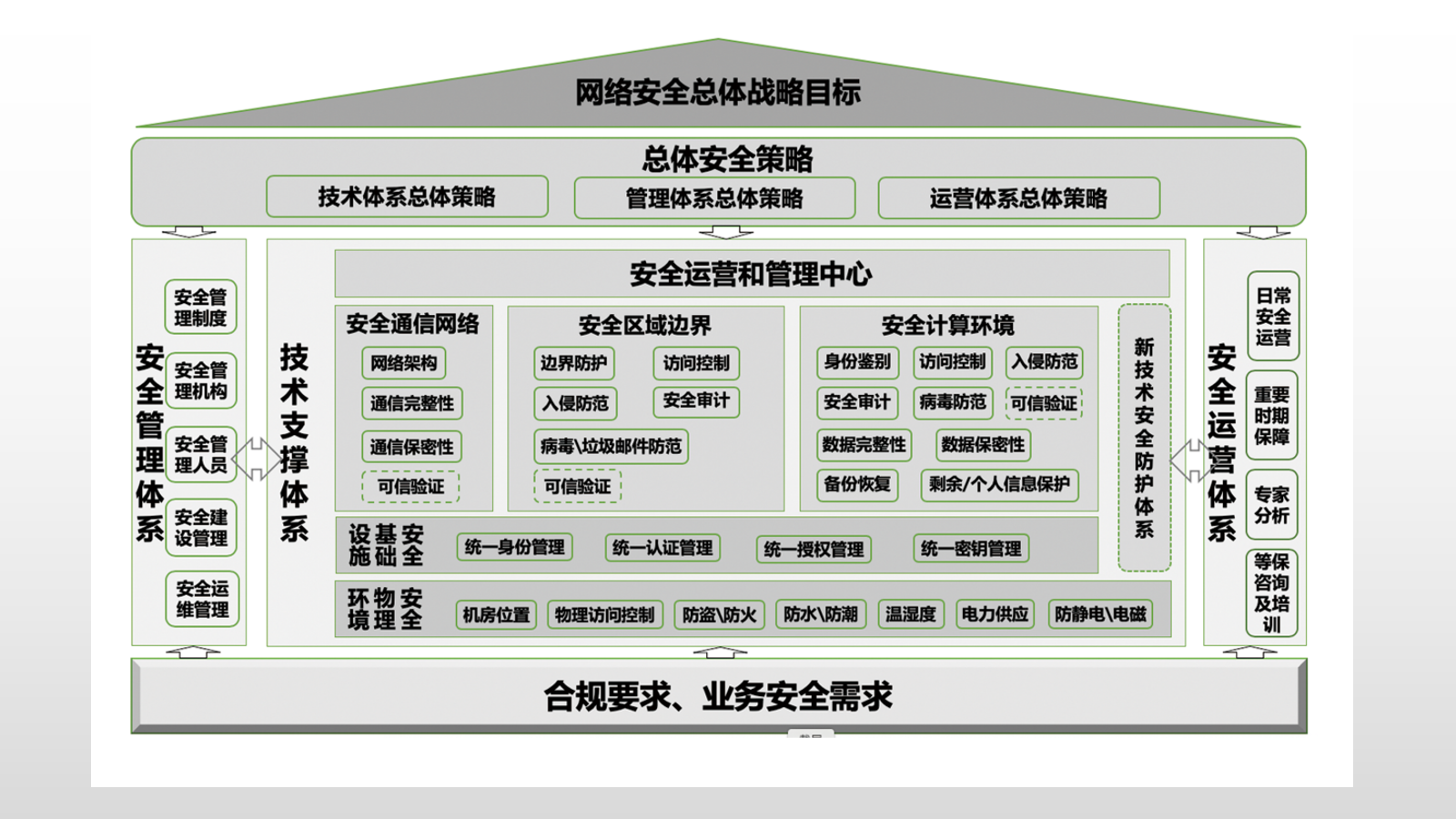 以“一个中心、三重防护、三个体系”为核心指导思想,构建集防护、检测、响应、恢复于一体的全面的安全保障体系。