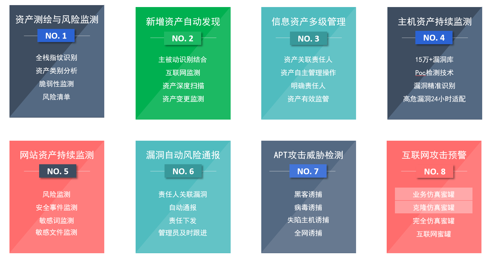 资产安全治理系统支持对网络资产进行全面、快速、准确的识别发现与安全排查,系统融合了空间资产探测模块、系统指纹识别模块、POC漏洞扫描模块、空间资产搜索模块等。系统内置有数十万多条指纹库、15万多条漏洞库、500多条POC检测库,支持漏洞一键验证,包括执行任意命令、读取任意文件等。方便用户快速摸清家底,精准发现漏洞,统计生成详细的全网资产报告,对自身的网络空间资产安全态势一目了然,从而满足日益增加的各种业务系统的安全需求。基于欺骗诱捕技术和精心构造的漏洞陷阱、混淆攻击目标,实现对所发现的攻击威胁流量的牵引、隔离,以及攻击特征的取证、溯源及反制,保护用户内部真实的资产。